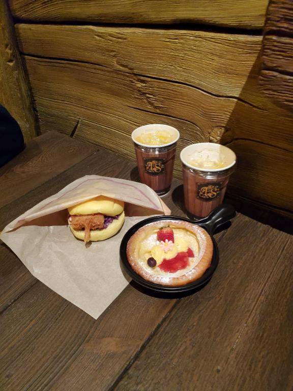 写真は、ラプンツェルのエリアのレストランて食べたバーガーとデザート?